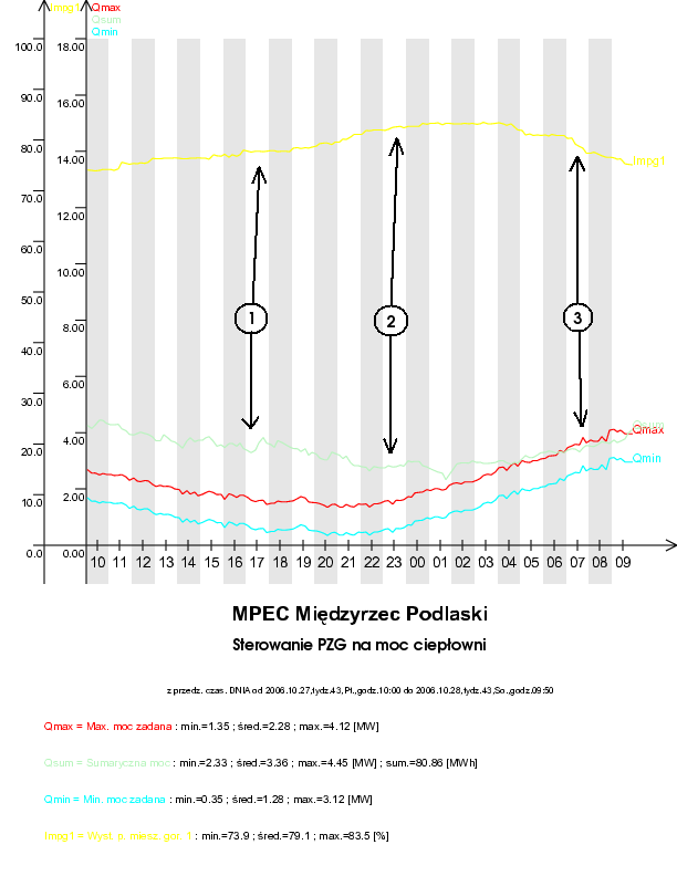 W sytuacji 3 - wzrasta zapotrzebowanie na moc ciepłowni (widełki mocy "podnoszą się"), wysterowanie pomp zmieszania gorącego spada - co powoduje wzrost mocy ciepłowni; w sytuacji 2 - zapotrzebowanie na moc stabilizuje się i wysterowanie pomp pozostaje stałe; sytuacja 1 jest odwrotna do 3 - widełki mocy "opadają", wysterowanie falownika rośnie - co powoduje spadek wydajności ciepłowni.