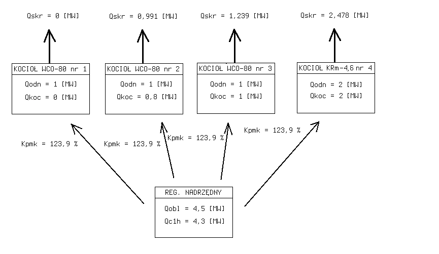 Na poniższym schemacie przedstawiono zespół kotłów pracujących według omawianego algorytmu zgodnie z powyższymi założeniami:
