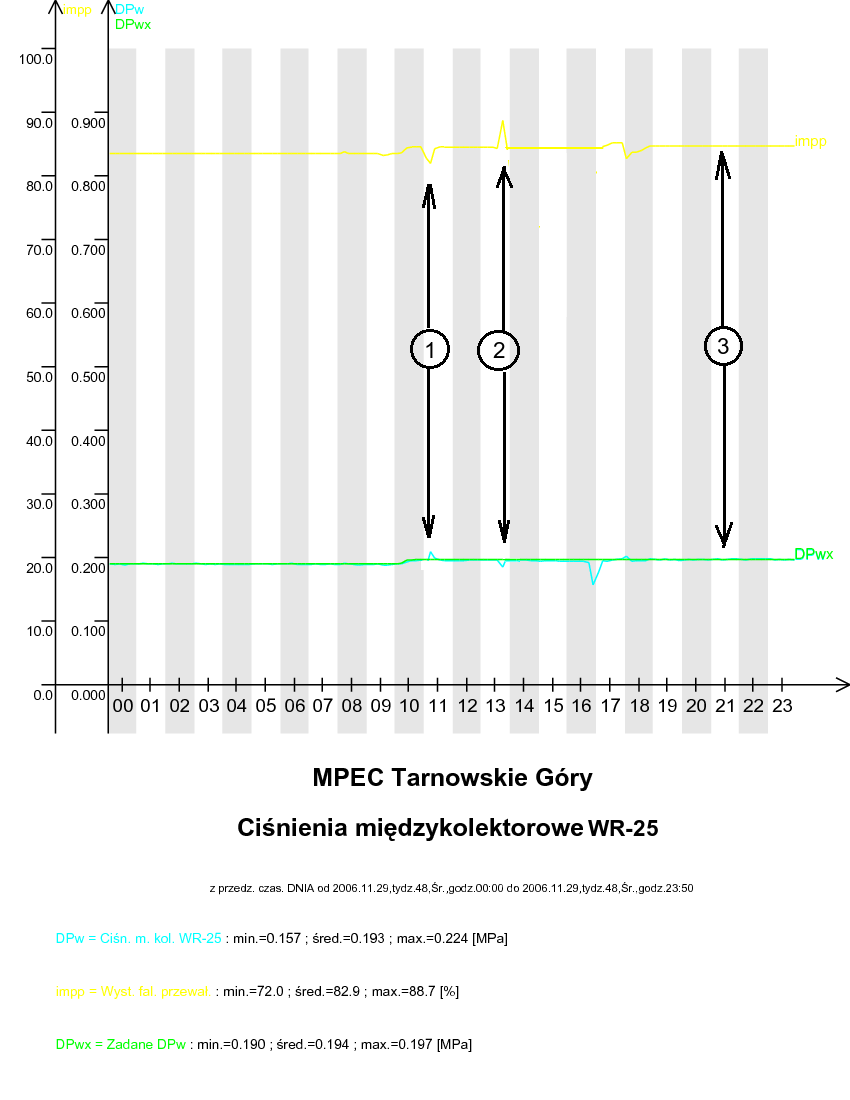 W punkcie 1 zaznaczono sytuację, gdy aktualna wartość ciśnienia międzykolektorowego WR-25 (funkcja 31)) jest większa od wartości zadanej (funkcja 30)) +0,003MPa. W tym przypadku następuje zmniejszenie wysterowania pompy przewałowej (funkcja 06). W punkcie 2 oznaczono sytuację, gdy aktualna wartość ciśnienia międzykolektorowego WR-25funkcja 31) jest mniejsza od wartości zadanej funkcja 30) -0,003MPa. W tym przypadku następuje zwiększenie wysterowania pompy przewałowej funkcja 06). W punkcie 3 zaznaczono sytuację, gdy aktualna wartość ciśnienia międzykolektorowego WR-25 (funkcja 31) jest równa z tolerancją +/-0,003 MPa wartości zadanej (funkcja 30). W tym przypadku pompa przewałowa (funkcja 06) nie zmienia swojego wysterowania.